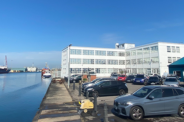 A spacious and bright open-plan office space with a waterside view onto Lady Bee Marina and Prominent frontage on the A259 coast road with parking spaces behind the office.